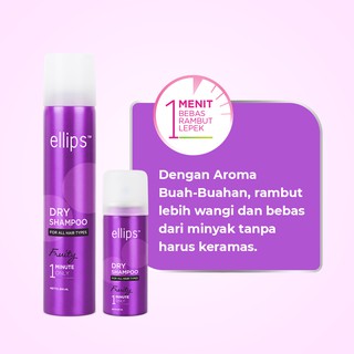Satu langkah praktis untuk rambut indah mengembang dengan Ellips Dry Shampoo. Diformulasikan khusus untuk membantu mengurangi minyak berlebih pada rambut dan kulit kepala dengan wangi buah-buahan yang tahan lama membuat rambut anda terasa lebih segar seperti sehabis keramas.